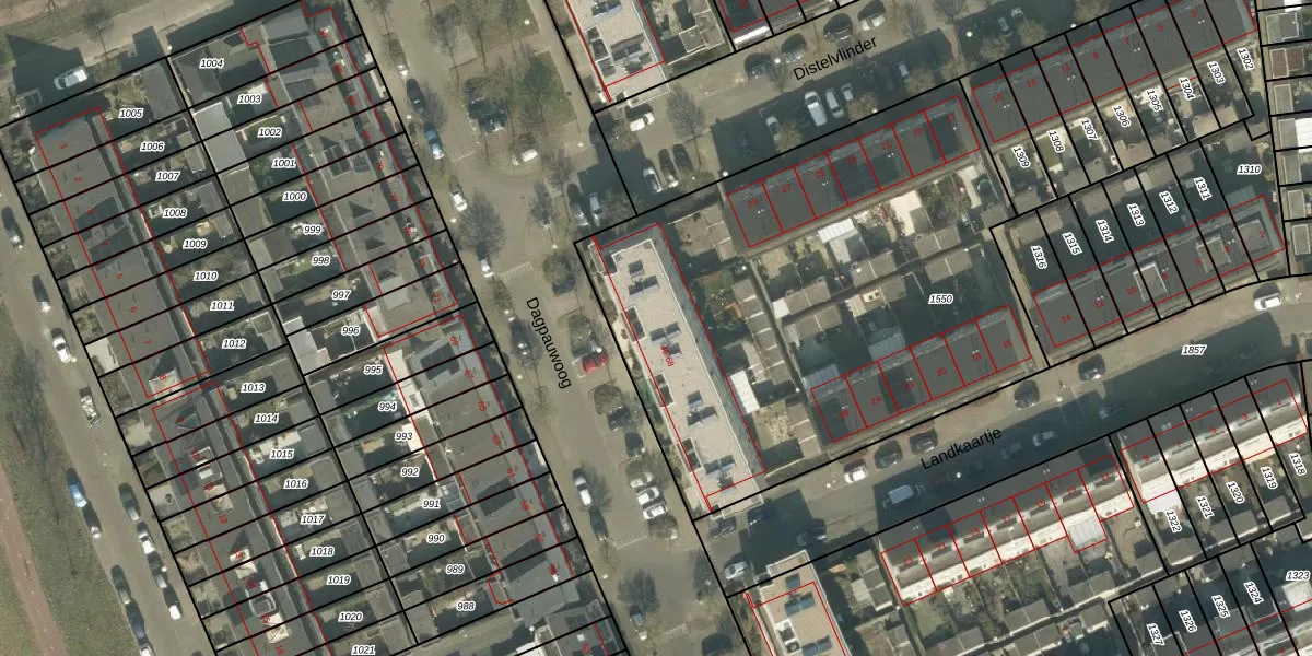 Het perceel waarop Dagpauwoog 60 staat heeft een oppervlakte van 2843 m². Dit is een zeer groot perceel. De perceeloppervlakte wordt geregistreerd door het Kadaster. Gedetailleerde informatie over de maten van dit perceel kunt u vinden in het rapport Kadastrale kaart met maatvoering van Dagpauwoog 60.