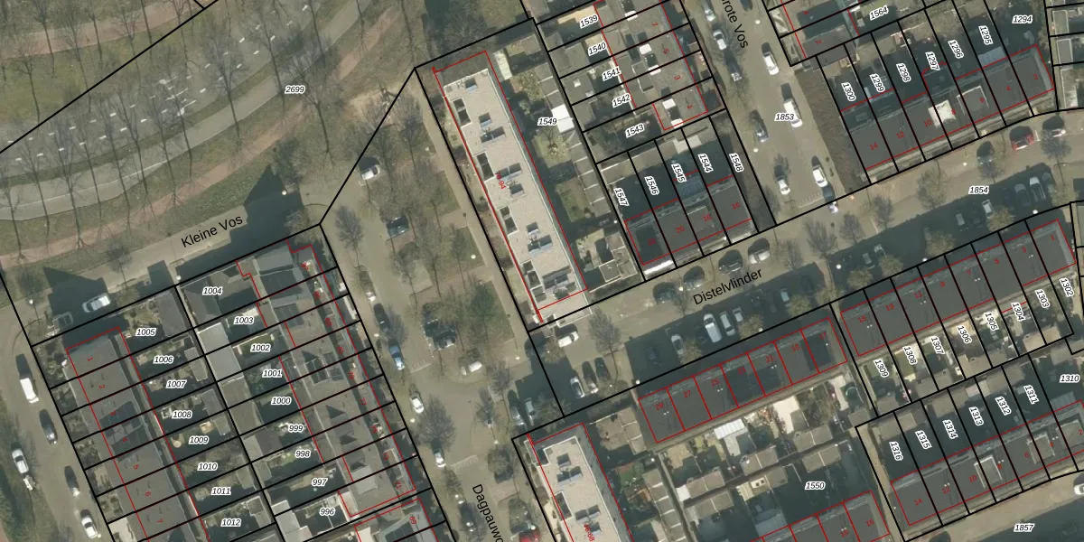 Het perceel waarop Dagpauwoog 70 staat heeft een oppervlakte van 1253 m². Dit is een zeer groot perceel. De perceeloppervlakte wordt geregistreerd door het Kadaster. Gedetailleerde informatie over de maten van dit perceel kunt u vinden in het rapport Kadastrale kaart met maatvoering van Dagpauwoog 70.