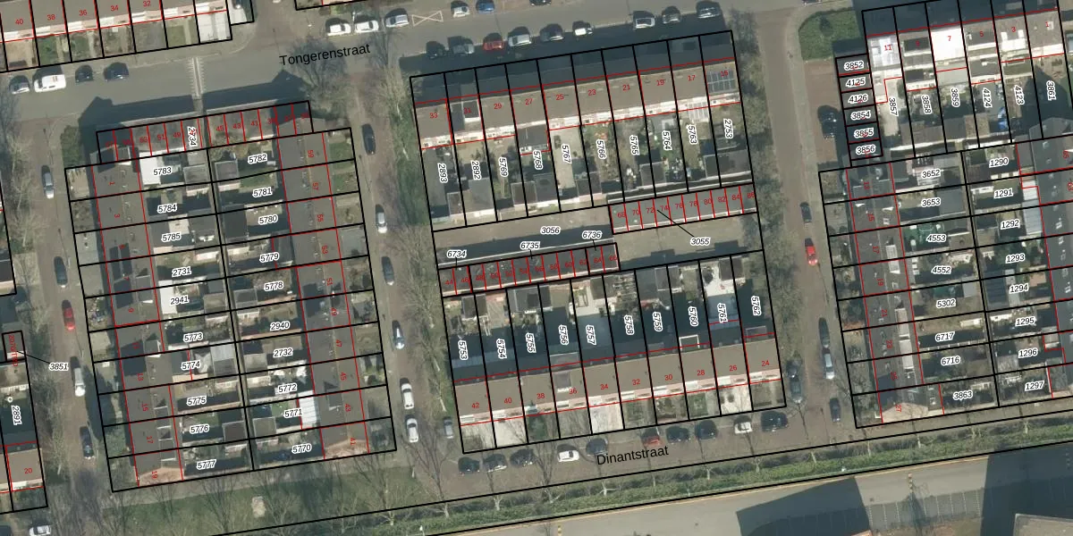 Dinantstraat 56 is gelegen op kadastraal perceel BDA00G6735. Deze kadastrale aanduiding is uniek en wordt gebruikt door het Kadaster om eigendomsrechten en andere zakelijke rechten vast te leggen. Het perceel maakt onderdeel uit van de kadastrale gemeente Breda.