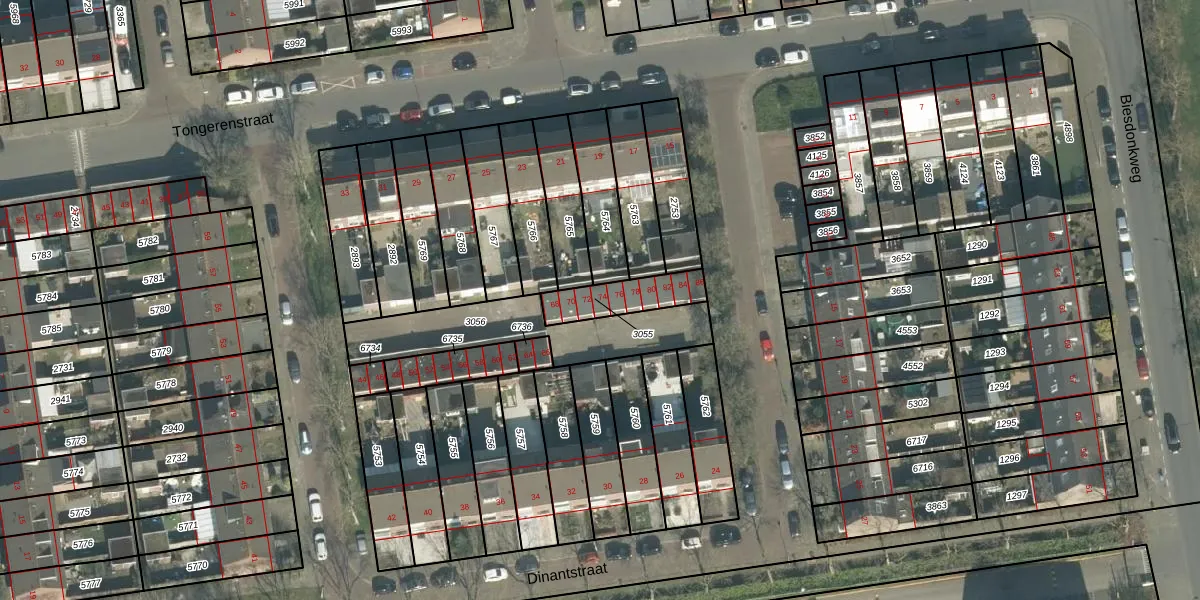 Dinantstraat 74 is gelegen op kadastraal perceel BDA00G3055. Deze kadastrale aanduiding is uniek en wordt gebruikt door het Kadaster om eigendomsrechten en andere zakelijke rechten vast te leggen. Het perceel maakt onderdeel uit van de kadastrale gemeente Breda.