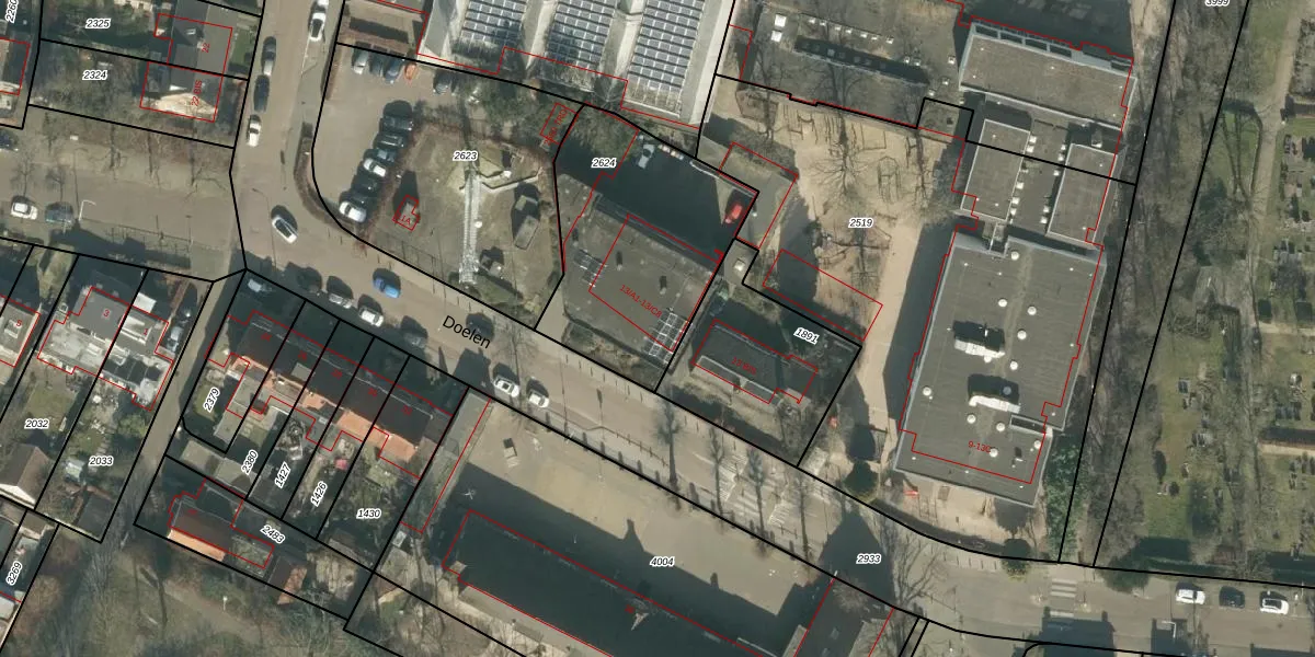 Het perceel waarop Doelen 13-A2 staat heeft een oppervlakte van 869 m². Dit is een groot perceel. De perceeloppervlakte wordt geregistreerd door het Kadaster. Gedetailleerde informatie over de maten van dit perceel kunt u vinden in het rapport Kadastrale kaart met maatvoering van Doelen 13-A2.