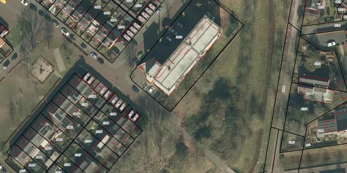 Het perceel waarop Doornenburgstraat 69-B staat heeft een oppervlakte van 2080 m². Dit is een zeer groot perceel. De perceeloppervlakte wordt geregistreerd door het Kadaster. Gedetailleerde informatie over de maten van dit perceel kunt u vinden in het rapport Kadastrale kaart met maatvoering van Doornenburgstraat 69-B.