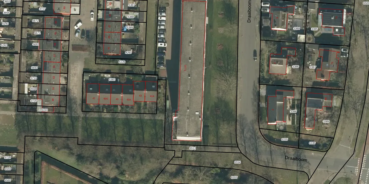 Het perceel waarop Draaiboom 21 staat heeft een oppervlakte van 4828 m². Dit is een zeer groot perceel. De perceeloppervlakte wordt geregistreerd door het Kadaster. Gedetailleerde informatie over de maten van dit perceel kunt u vinden in het rapport Kadastrale kaart met maatvoering van Draaiboom 21.