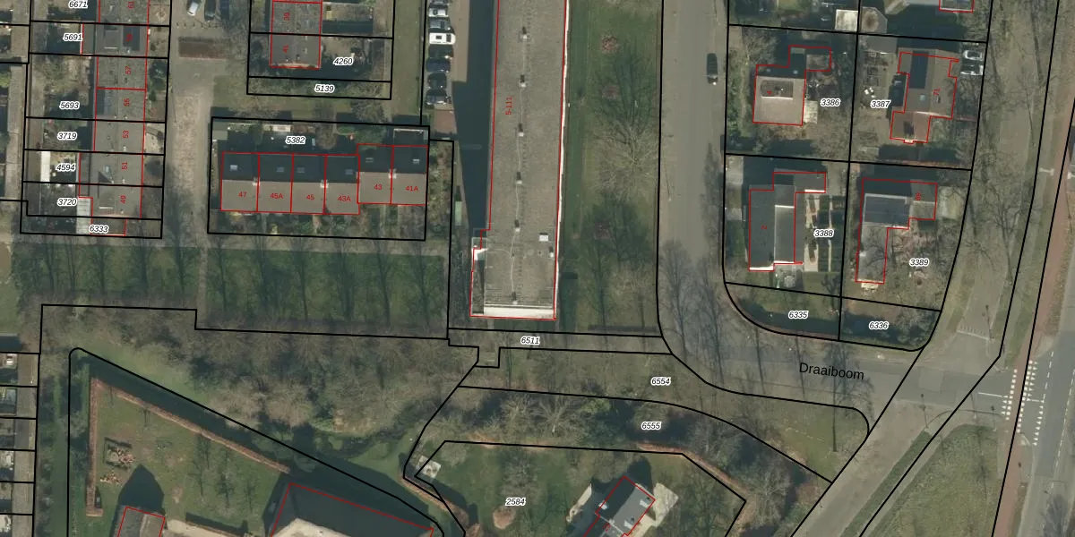 Het perceel waarop Draaiboom 81 staat heeft een oppervlakte van 4828 m². Dit is een zeer groot perceel. De perceeloppervlakte wordt geregistreerd door het Kadaster. Gedetailleerde informatie over de maten van dit perceel kunt u vinden in het rapport Kadastrale kaart met maatvoering van Draaiboom 81.