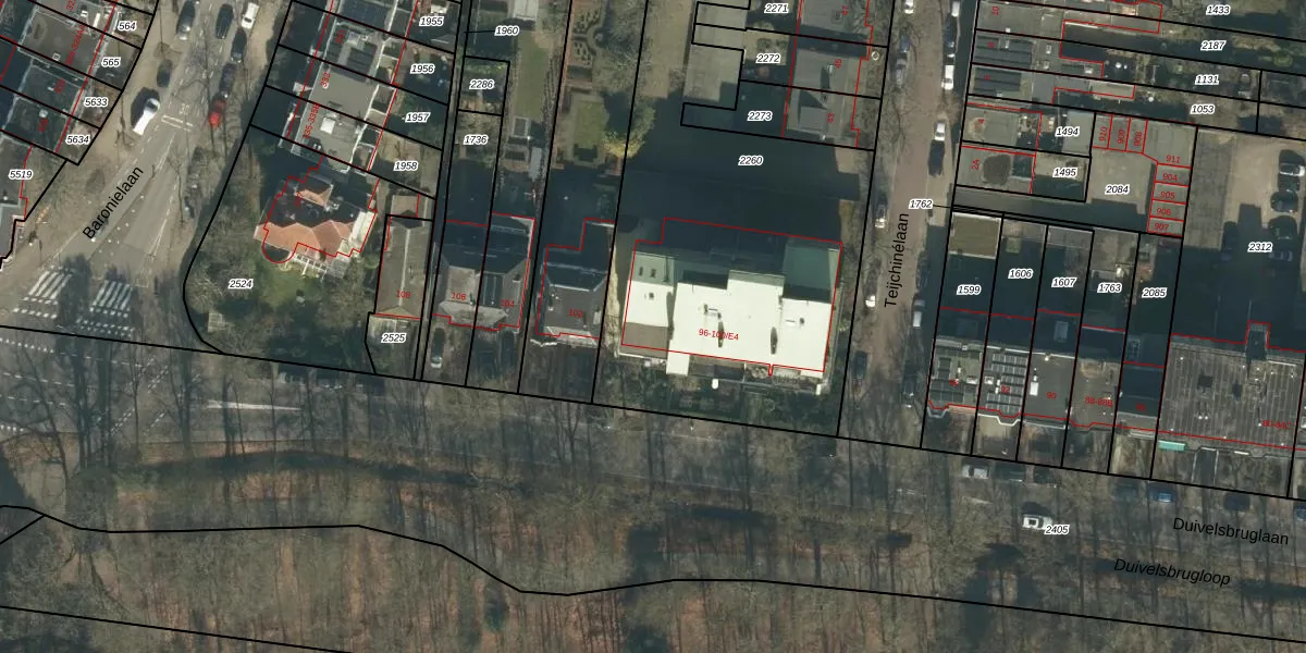 Duivelsbruglaan 100-B1 is gelegen op kadastraal perceel GNK02H2260. Deze kadastrale aanduiding is uniek en wordt gebruikt door het Kadaster om eigendomsrechten en andere zakelijke rechten vast te leggen. Het perceel maakt onderdeel uit van de kadastrale gemeente Ginneken.