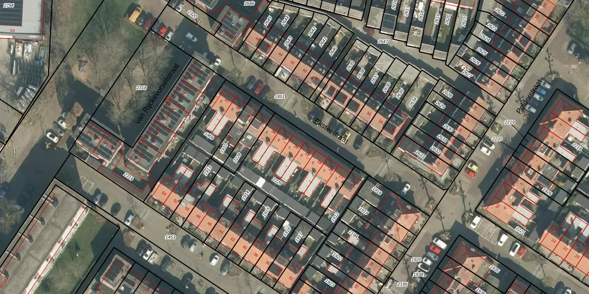 Het perceel waarop Eksterstraat 35 staat heeft een oppervlakte van 1285 m². Dit is een zeer groot perceel. De perceeloppervlakte wordt geregistreerd door het Kadaster. Gedetailleerde informatie over de maten van dit perceel kunt u vinden in het rapport Kadastrale kaart met maatvoering van Eksterstraat 35.