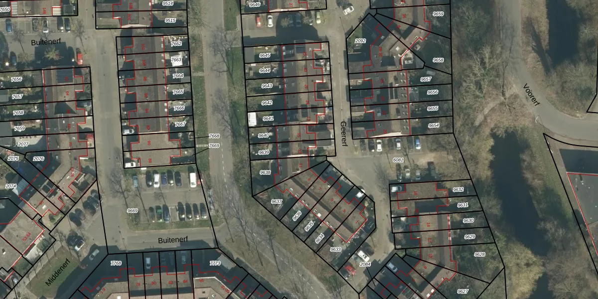 Geererf 13 is gelegen op kadastraal perceel BDA00H9639. Deze kadastrale aanduiding is uniek en wordt gebruikt door het Kadaster om eigendomsrechten en andere zakelijke rechten vast te leggen. Het perceel maakt onderdeel uit van de kadastrale gemeente Breda.