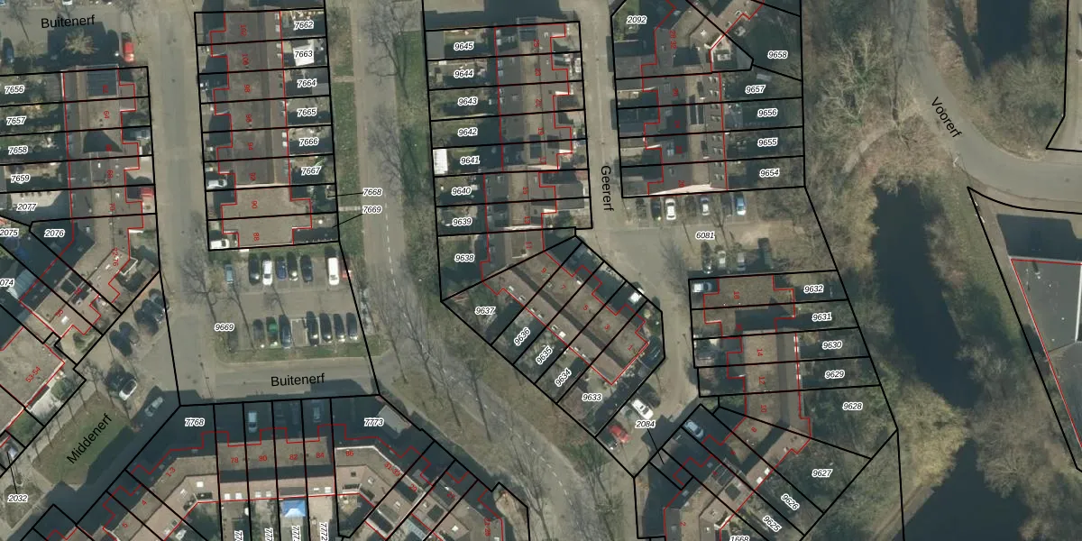 Geererf 9 is gelegen op kadastraal perceel BDA00H9637. Deze kadastrale aanduiding is uniek en wordt gebruikt door het Kadaster om eigendomsrechten en andere zakelijke rechten vast te leggen. Het perceel maakt onderdeel uit van de kadastrale gemeente Breda.