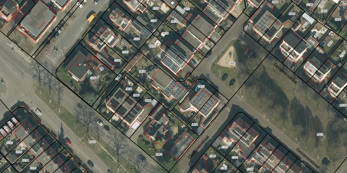 Het perceel waarop Geisterenstraat 5 staat heeft een oppervlakte van 682 m². Dit is een groot perceel. De perceeloppervlakte wordt geregistreerd door het Kadaster. Gedetailleerde informatie over de maten van dit perceel kunt u vinden in het rapport Kadastrale kaart met maatvoering van Geisterenstraat 5.