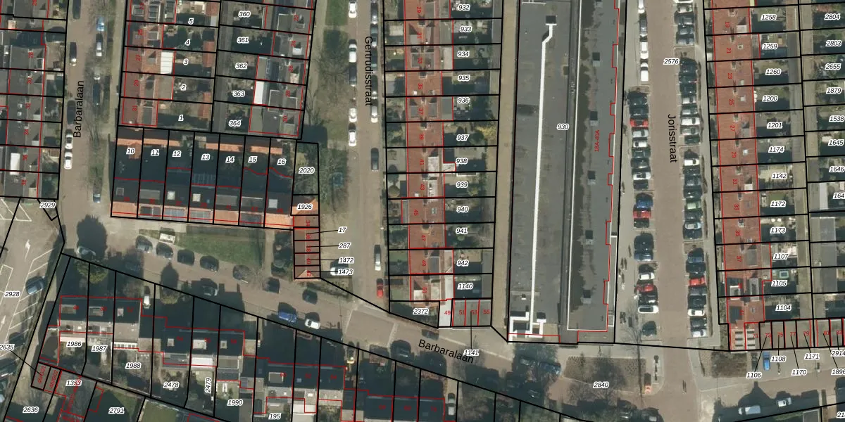 Het perceel waarop Gertrudisstraat 45 staat heeft een oppervlakte van 153 m². Dit is een middelgroot perceel. De perceeloppervlakte wordt geregistreerd door het Kadaster. Gedetailleerde informatie over de maten van dit perceel kunt u vinden in het rapport Kadastrale kaart met maatvoering van Gertrudisstraat 45.