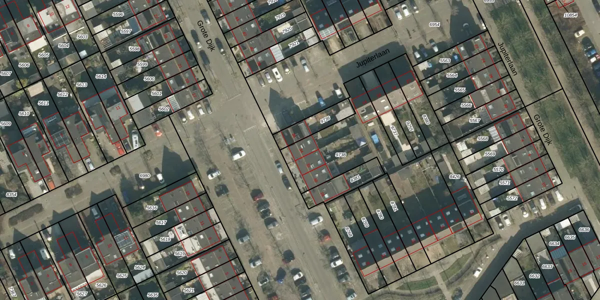 Het perceel waarop Grote Dijk 34 staat heeft een oppervlakte van 1210 m². Dit is een zeer groot perceel. De perceeloppervlakte wordt geregistreerd door het Kadaster. Gedetailleerde informatie over de maten van dit perceel kunt u vinden in het rapport Kadastrale kaart met maatvoering van Grote Dijk 34.