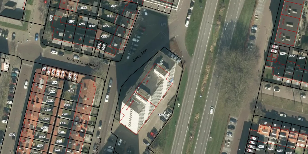 Grote Spie 15 is gelegen op kadastraal perceel BDA00E5933. Deze kadastrale aanduiding is uniek en wordt gebruikt door het Kadaster om eigendomsrechten en andere zakelijke rechten vast te leggen. Het perceel maakt onderdeel uit van de kadastrale gemeente Breda.