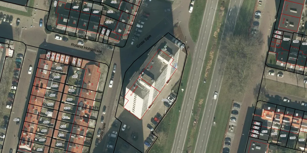 Het perceel waarop Grote Spie 35 staat heeft een oppervlakte van 2165 m². Dit is een zeer groot perceel. De perceeloppervlakte wordt geregistreerd door het Kadaster. Gedetailleerde informatie over de maten van dit perceel kunt u vinden in het rapport Kadastrale kaart met maatvoering van Grote Spie 35.
