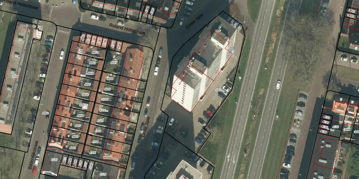 Grote Spie 75 is gelegen op kadastraal perceel BDA00E5933. Deze kadastrale aanduiding is uniek en wordt gebruikt door het Kadaster om eigendomsrechten en andere zakelijke rechten vast te leggen. Het perceel maakt onderdeel uit van de kadastrale gemeente Breda.