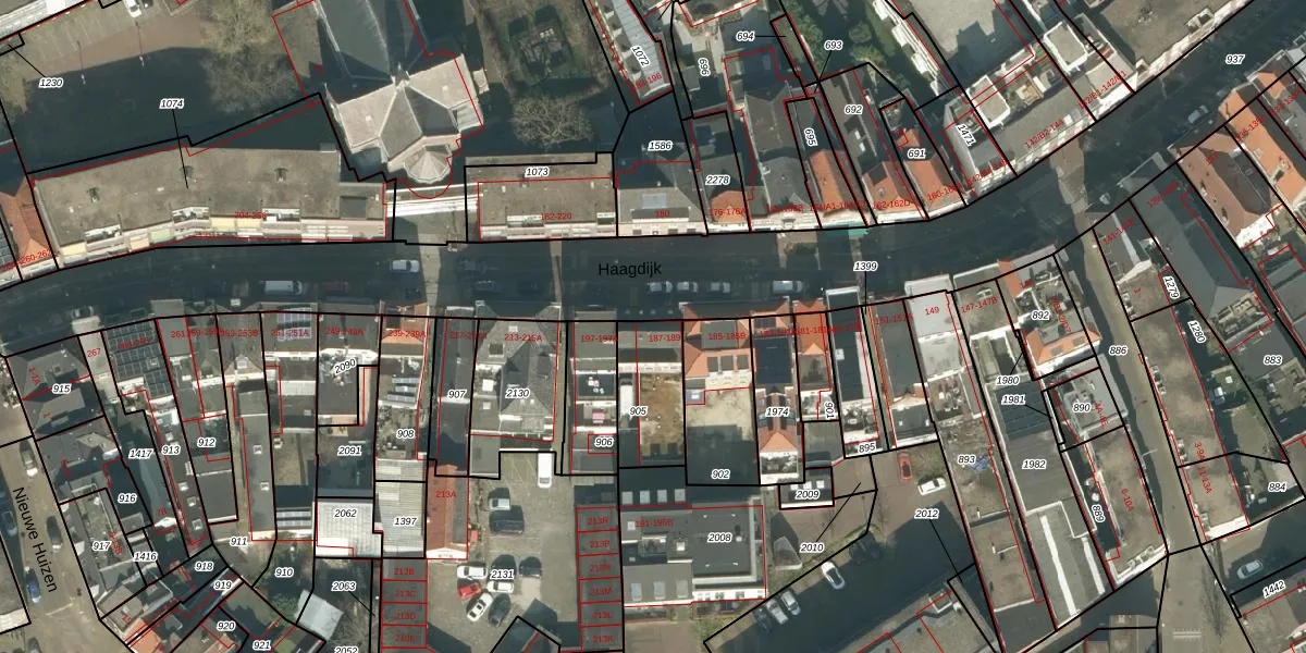 Haagdijk 187 is gelegen op kadastraal perceel BDA00F905. Deze kadastrale aanduiding is uniek en wordt gebruikt door het Kadaster om eigendomsrechten en andere zakelijke rechten vast te leggen. Het perceel maakt onderdeel uit van de kadastrale gemeente Breda.