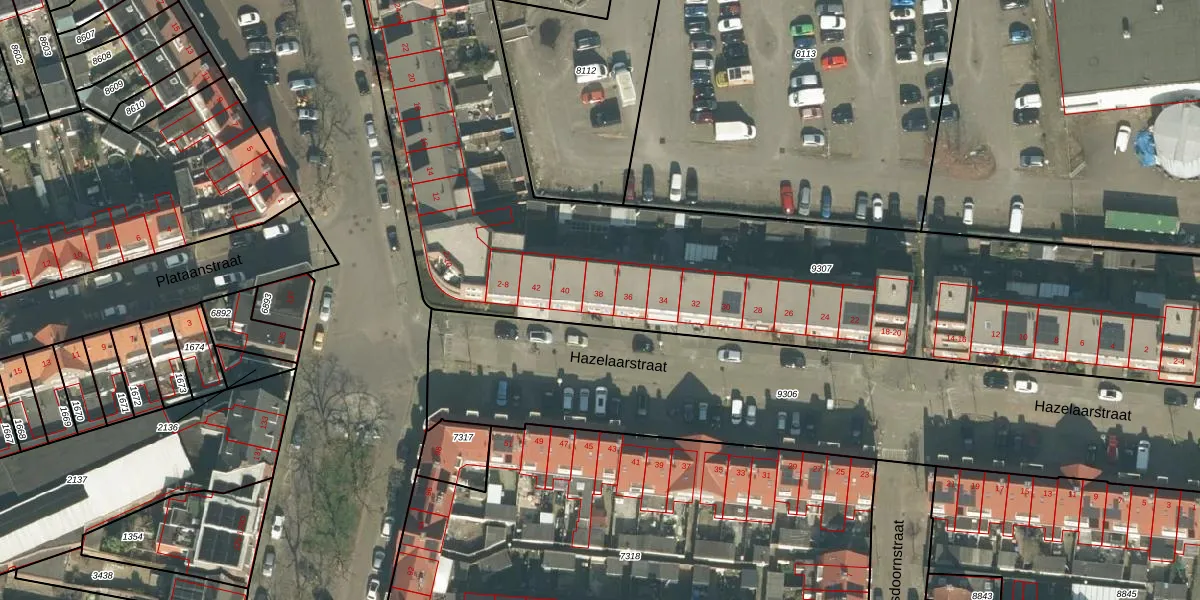 Hazelaarstraat 38 is gelegen op kadastraal perceel BDA00A9307. Deze kadastrale aanduiding is uniek en wordt gebruikt door het Kadaster om eigendomsrechten en andere zakelijke rechten vast te leggen. Het perceel maakt onderdeel uit van de kadastrale gemeente Breda.