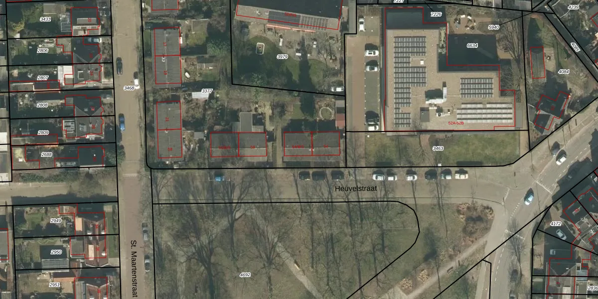 Het perceel waarop Heuvelstraat 54-BIS staat heeft een oppervlakte van 3200 m². Dit is een zeer groot perceel. De perceeloppervlakte wordt geregistreerd door het Kadaster. Gedetailleerde informatie over de maten van dit perceel kunt u vinden in het rapport Kadastrale kaart met maatvoering van Heuvelstraat 54-BIS.