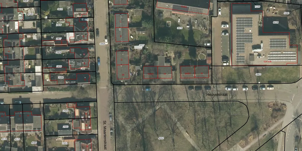 Het perceel waarop Heuvelstraat 56-BIS staat heeft een oppervlakte van 3200 m². Dit is een zeer groot perceel. De perceeloppervlakte wordt geregistreerd door het Kadaster. Gedetailleerde informatie over de maten van dit perceel kunt u vinden in het rapport Kadastrale kaart met maatvoering van Heuvelstraat 56-BIS.