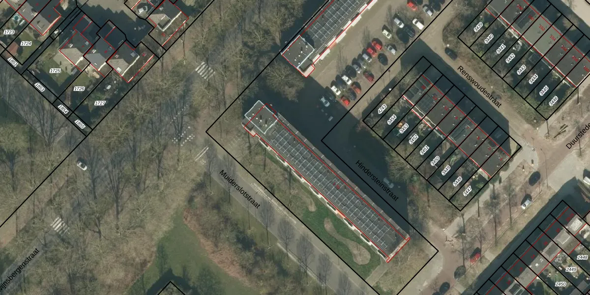 Het perceel waarop Hindersteinstraat 63 staat heeft een oppervlakte van 1,2 ha. Dit is een zeer groot perceel. De perceeloppervlakte wordt geregistreerd door het Kadaster. Gedetailleerde informatie over de maten van dit perceel kunt u vinden in het rapport Kadastrale kaart met maatvoering van Hindersteinstraat 63.