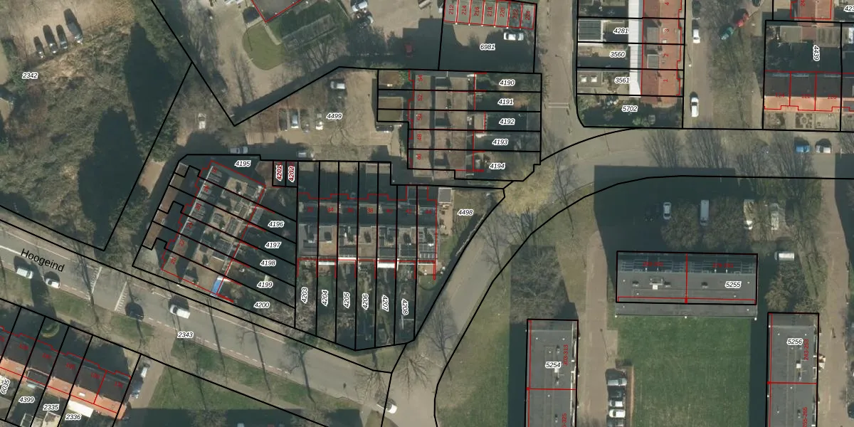 Het perceel waarop Hoogeind 44 staat heeft een oppervlakte van 353 m². Dit is een groot perceel. De perceeloppervlakte wordt geregistreerd door het Kadaster. Gedetailleerde informatie over de maten van dit perceel kunt u vinden in het rapport Kadastrale kaart met maatvoering van Hoogeind 44.