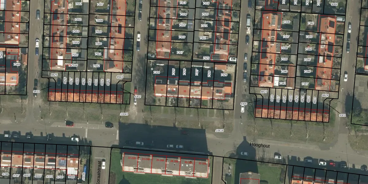 Het perceel waarop Hooghout 35 staat heeft een oppervlakte van 155 m². Dit is een middelgroot perceel. De perceeloppervlakte wordt geregistreerd door het Kadaster. Gedetailleerde informatie over de maten van dit perceel kunt u vinden in het rapport Kadastrale kaart met maatvoering van Hooghout 35.