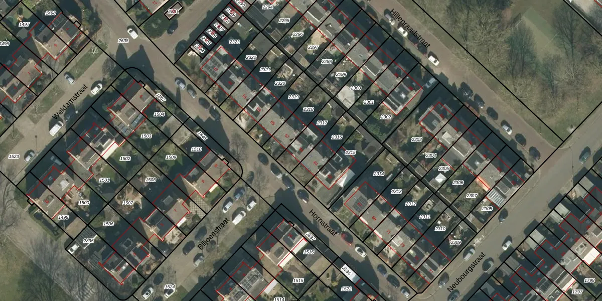 Het perceel waarop Hornstraat 59 staat heeft een oppervlakte van 181 m². Dit is een middelgroot perceel. De perceeloppervlakte wordt geregistreerd door het Kadaster. Gedetailleerde informatie over de maten van dit perceel kunt u vinden in het rapport Kadastrale kaart met maatvoering van Hornstraat 59.