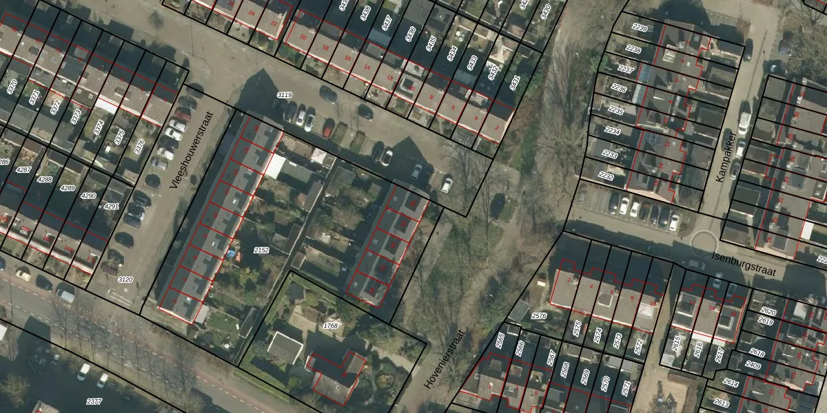 Het perceel waarop Hovenierstraat 56 staat heeft een oppervlakte van 2417 m². Dit is een zeer groot perceel. De perceeloppervlakte wordt geregistreerd door het Kadaster. Gedetailleerde informatie over de maten van dit perceel kunt u vinden in het rapport Kadastrale kaart met maatvoering van Hovenierstraat 56.
