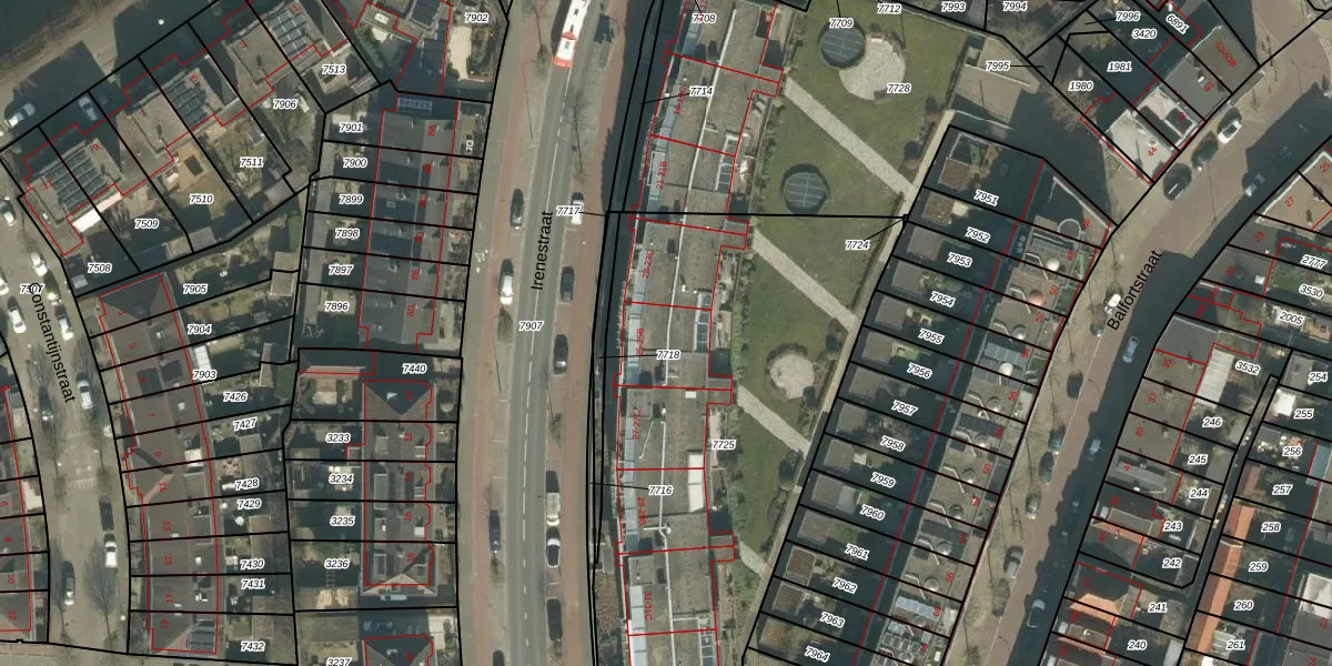 Het perceel waarop Irenestraat 25-A staat heeft een oppervlakte van 2707 m². Dit is een zeer groot perceel. De perceeloppervlakte wordt geregistreerd door het Kadaster. Gedetailleerde informatie over de maten van dit perceel kunt u vinden in het rapport Kadastrale kaart met maatvoering van Irenestraat 25-A.
