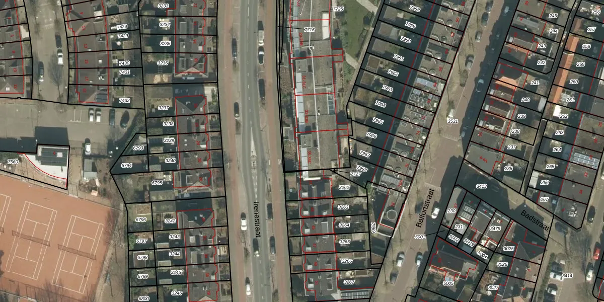 Het perceel waarop Irenestraat 35 staat heeft een oppervlakte van 2707 m². Dit is een zeer groot perceel. De perceeloppervlakte wordt geregistreerd door het Kadaster. Gedetailleerde informatie over de maten van dit perceel kunt u vinden in het rapport Kadastrale kaart met maatvoering van Irenestraat 35.