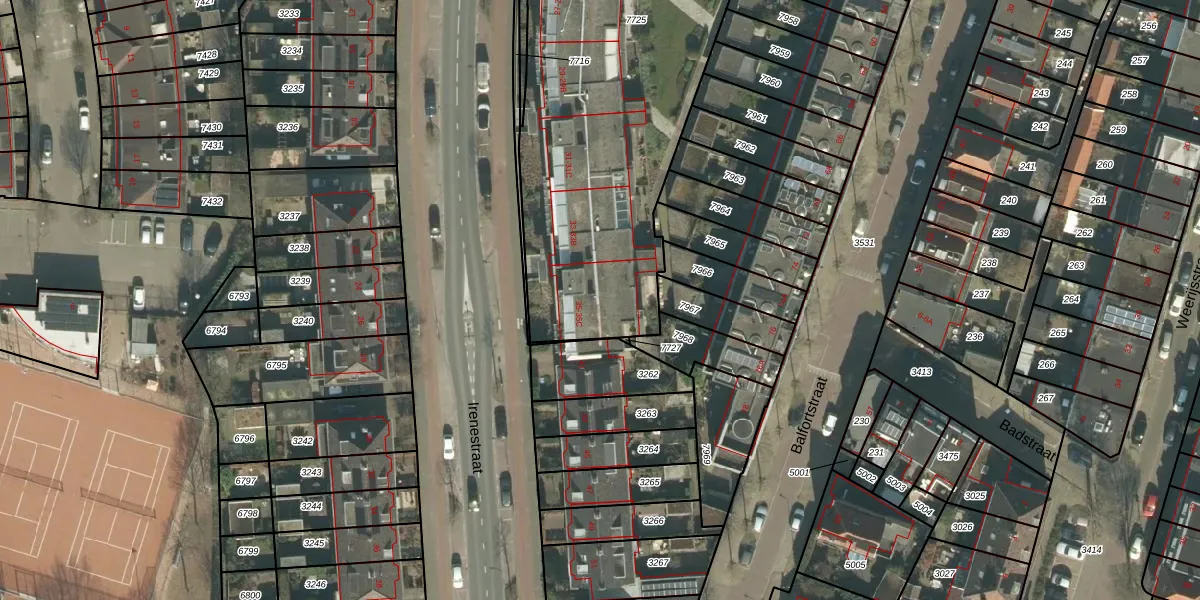 Het perceel waarop Irenestraat 35-B staat heeft een oppervlakte van 2707 m². Dit is een zeer groot perceel. De perceeloppervlakte wordt geregistreerd door het Kadaster. Gedetailleerde informatie over de maten van dit perceel kunt u vinden in het rapport Kadastrale kaart met maatvoering van Irenestraat 35-B.