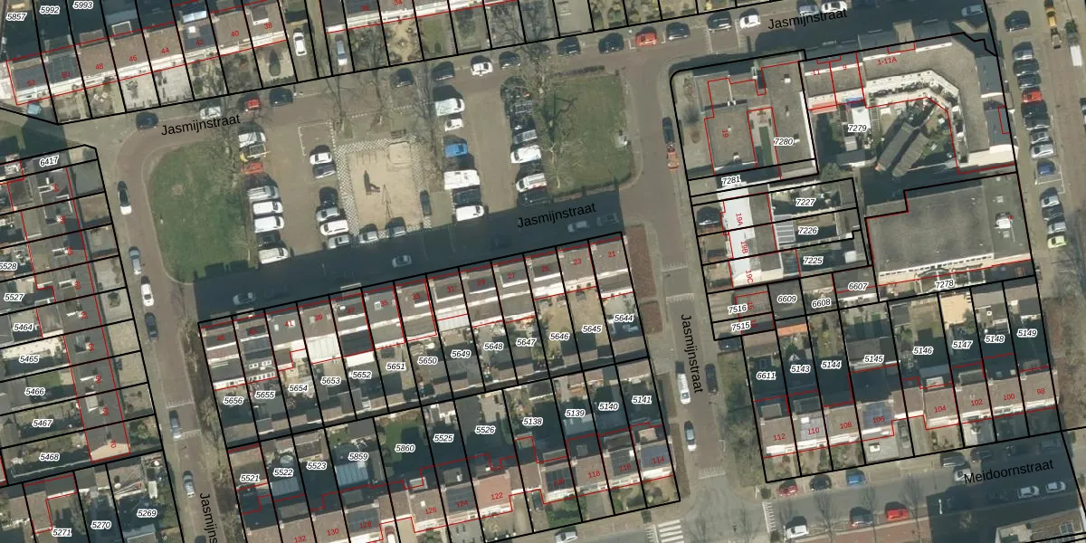 Het perceel waarop Jasmijnstraat 25 staat heeft een oppervlakte van 143 m². Dit is een middelgroot perceel. De perceeloppervlakte wordt geregistreerd door het Kadaster. Gedetailleerde informatie over de maten van dit perceel kunt u vinden in het rapport Kadastrale kaart met maatvoering van Jasmijnstraat 25.