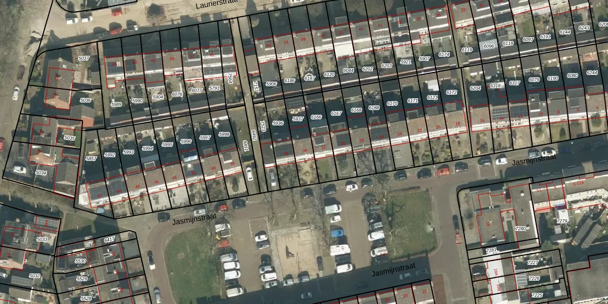 Het perceel waarop Jasmijnstraat 34 staat heeft een oppervlakte van 187 m². Dit is een middelgroot perceel. De perceeloppervlakte wordt geregistreerd door het Kadaster. Gedetailleerde informatie over de maten van dit perceel kunt u vinden in het rapport Kadastrale kaart met maatvoering van Jasmijnstraat 34.