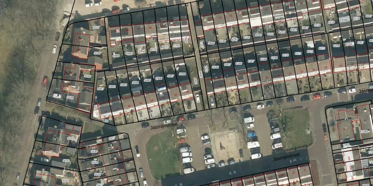 Het perceel waarop Jasmijnstraat 38 staat heeft een oppervlakte van 188 m². Dit is een middelgroot perceel. De perceeloppervlakte wordt geregistreerd door het Kadaster. Gedetailleerde informatie over de maten van dit perceel kunt u vinden in het rapport Kadastrale kaart met maatvoering van Jasmijnstraat 38.