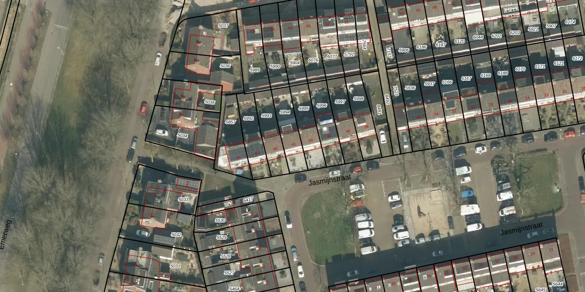 Het perceel waarop Jasmijnstraat 46 staat heeft een oppervlakte van 188 m². Dit is een middelgroot perceel. De perceeloppervlakte wordt geregistreerd door het Kadaster. Gedetailleerde informatie over de maten van dit perceel kunt u vinden in het rapport Kadastrale kaart met maatvoering van Jasmijnstraat 46.