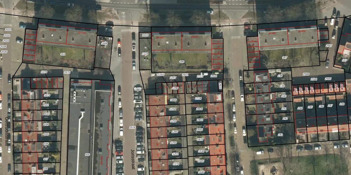Het perceel waarop Jorisstraat 9 staat heeft een oppervlakte van 19 m². Dit is een klein perceel. De perceeloppervlakte wordt geregistreerd door het Kadaster. Gedetailleerde informatie over de maten van dit perceel kunt u vinden in het rapport Kadastrale kaart met maatvoering van Jorisstraat 9.