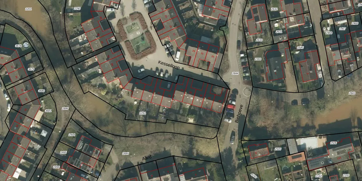 Het perceel waarop Kesselloop 56 staat heeft een oppervlakte van 2005 m². Dit is een zeer groot perceel. De perceeloppervlakte wordt geregistreerd door het Kadaster. Gedetailleerde informatie over de maten van dit perceel kunt u vinden in het rapport Kadastrale kaart met maatvoering van Kesselloop 56.