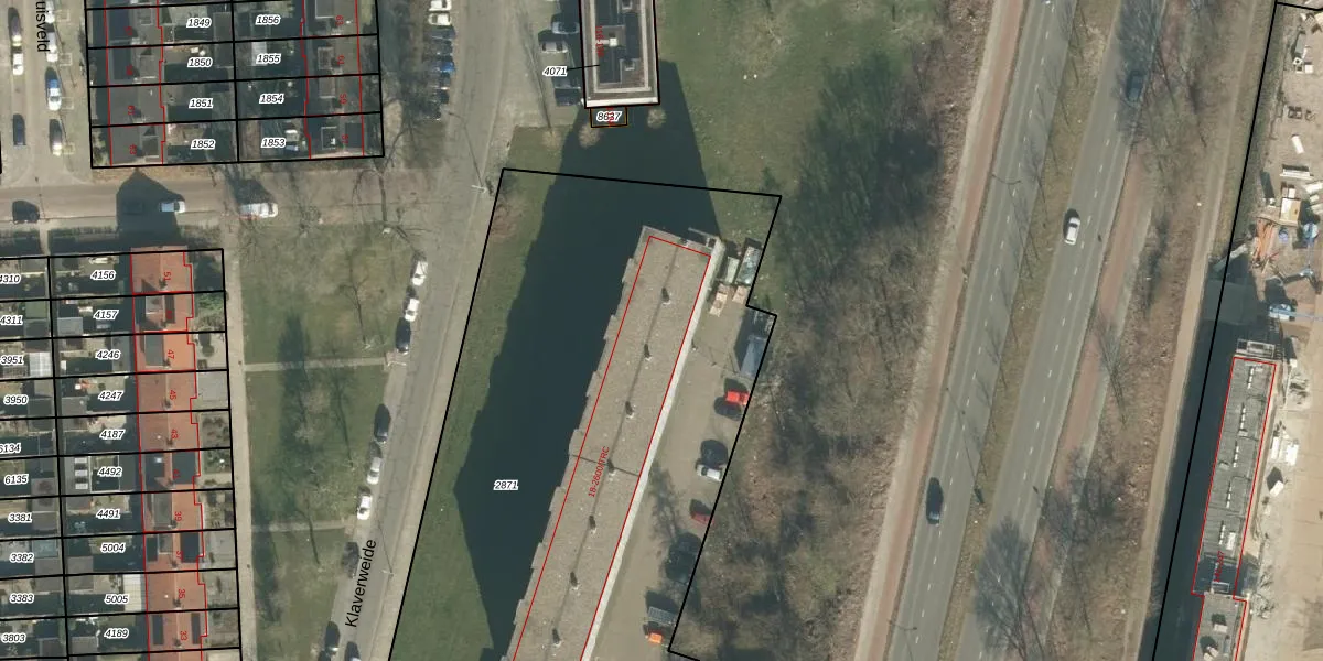 Het perceel waarop Klaverweide 100 staat heeft een oppervlakte van 5168 m². Dit is een zeer groot perceel. De perceeloppervlakte wordt geregistreerd door het Kadaster. Gedetailleerde informatie over de maten van dit perceel kunt u vinden in het rapport Kadastrale kaart met maatvoering van Klaverweide 100.