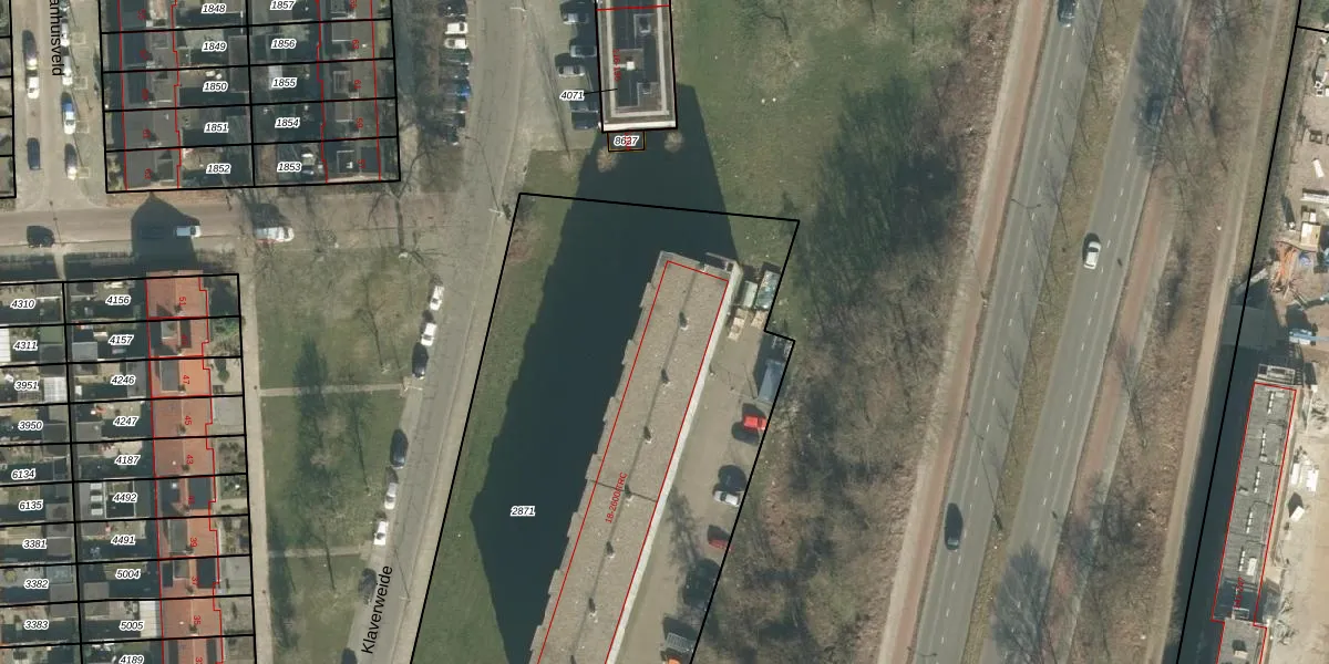 Het perceel waarop Klaverweide 106 staat heeft een oppervlakte van 5168 m². Dit is een zeer groot perceel. De perceeloppervlakte wordt geregistreerd door het Kadaster. Gedetailleerde informatie over de maten van dit perceel kunt u vinden in het rapport Kadastrale kaart met maatvoering van Klaverweide 106.