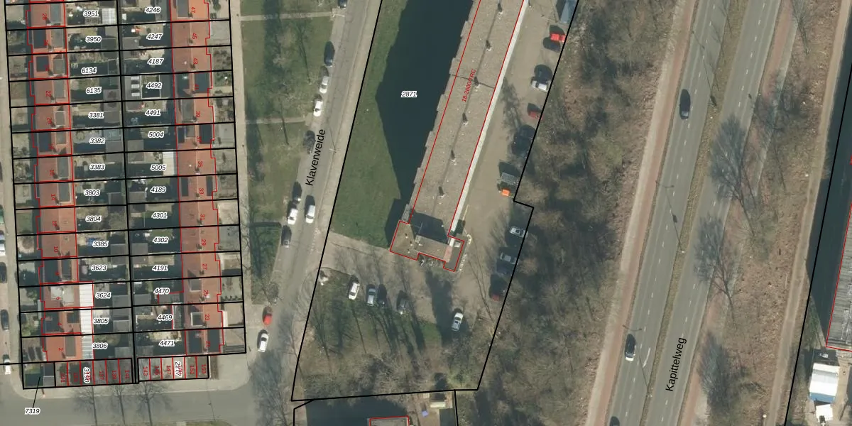 Het perceel waarop Klaverweide 22 staat heeft een oppervlakte van 5168 m². Dit is een zeer groot perceel. De perceeloppervlakte wordt geregistreerd door het Kadaster. Gedetailleerde informatie over de maten van dit perceel kunt u vinden in het rapport Kadastrale kaart met maatvoering van Klaverweide 22.