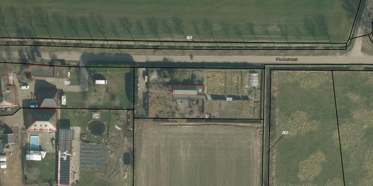 Het perceel waarop Kluisstraat 2-A staat heeft een oppervlakte van 1900 m². Dit is een zeer groot perceel. De perceeloppervlakte wordt geregistreerd door het Kadaster. Gedetailleerde informatie over de maten van dit perceel kunt u vinden in het rapport Kadastrale kaart met maatvoering van Kluisstraat 2-A.