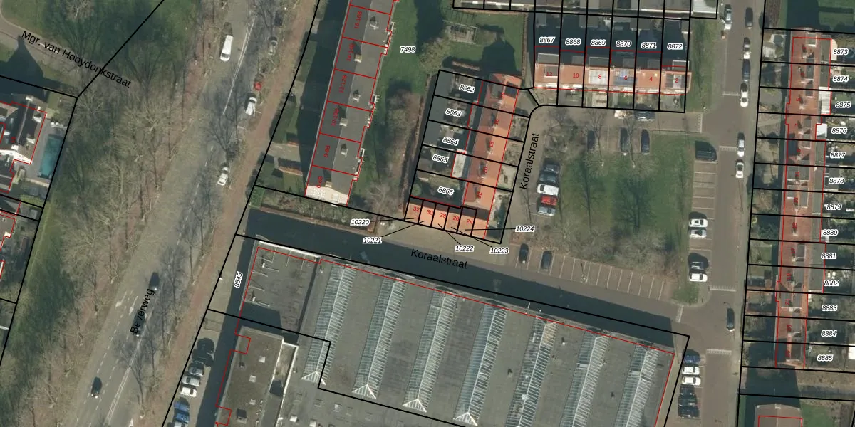 Koraalstraat 30 is gelegen op kadastraal perceel BDA00D10221. Deze kadastrale aanduiding is uniek en wordt gebruikt door het Kadaster om eigendomsrechten en andere zakelijke rechten vast te leggen. Het perceel maakt onderdeel uit van de kadastrale gemeente Breda.