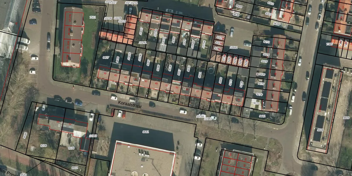 Koraalstraat 53 is gelegen op kadastraal perceel BDA00D9957. Deze kadastrale aanduiding is uniek en wordt gebruikt door het Kadaster om eigendomsrechten en andere zakelijke rechten vast te leggen. Het perceel maakt onderdeel uit van de kadastrale gemeente Breda.