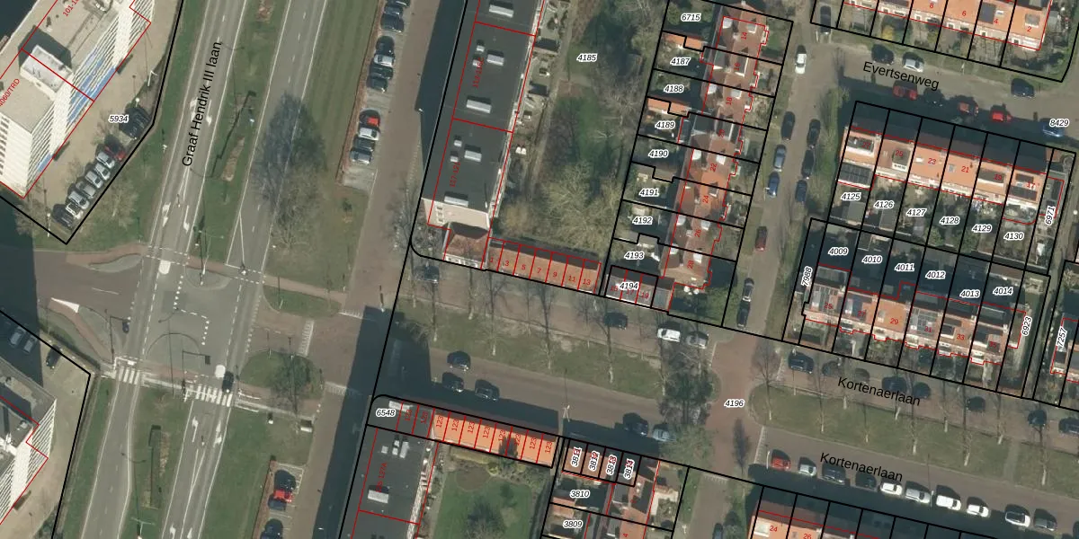Kortenaerlaan 7 is gelegen op kadastraal perceel BDA00E4185. Deze kadastrale aanduiding is uniek en wordt gebruikt door het Kadaster om eigendomsrechten en andere zakelijke rechten vast te leggen. Het perceel maakt onderdeel uit van de kadastrale gemeente Breda.