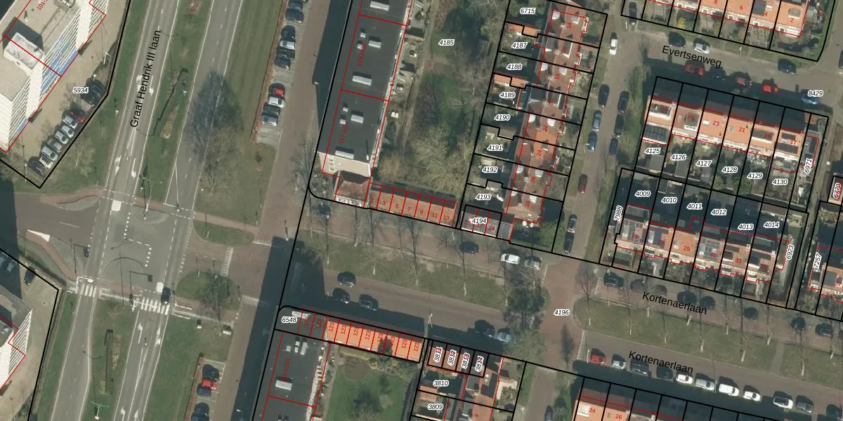 Kortenaerlaan 9 is gelegen op kadastraal perceel BDA00E4185. Deze kadastrale aanduiding is uniek en wordt gebruikt door het Kadaster om eigendomsrechten en andere zakelijke rechten vast te leggen. Het perceel maakt onderdeel uit van de kadastrale gemeente Breda.