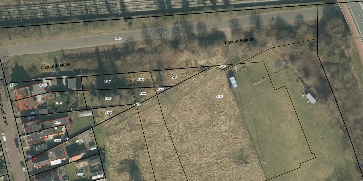 Het perceel waarop Lacourdestede 80 staat heeft een oppervlakte van 4440 m². Dit is een zeer groot perceel. De perceeloppervlakte wordt geregistreerd door het Kadaster. Gedetailleerde informatie over de maten van dit perceel kunt u vinden in het rapport Kadastrale kaart met maatvoering van Lacourdestede 80.