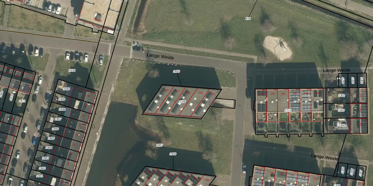 Het perceel waarop Lange Weide 215 staat heeft een oppervlakte van 585 m². Dit is een groot perceel. De perceeloppervlakte wordt geregistreerd door het Kadaster. Gedetailleerde informatie over de maten van dit perceel kunt u vinden in het rapport Kadastrale kaart met maatvoering van Lange Weide 215.
