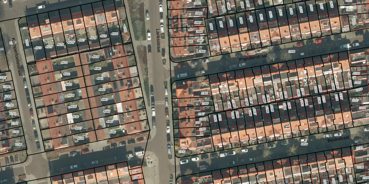 Lariksstraat 24-A is gelegen op kadastraal perceel BDA00E2365. Deze kadastrale aanduiding is uniek en wordt gebruikt door het Kadaster om eigendomsrechten en andere zakelijke rechten vast te leggen. Het perceel maakt onderdeel uit van de kadastrale gemeente Breda.