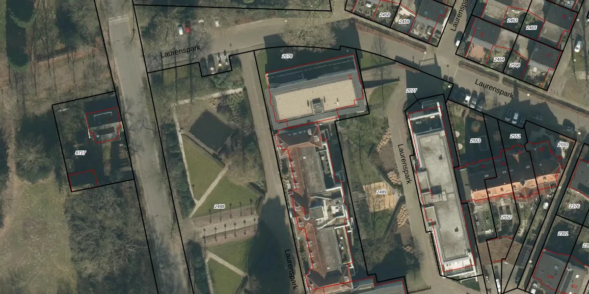 Het perceel waarop Laurenspark 12 staat heeft een oppervlakte van 2896 m². Dit is een zeer groot perceel. De perceeloppervlakte wordt geregistreerd door het Kadaster. Gedetailleerde informatie over de maten van dit perceel kunt u vinden in het rapport Kadastrale kaart met maatvoering van Laurenspark 12.