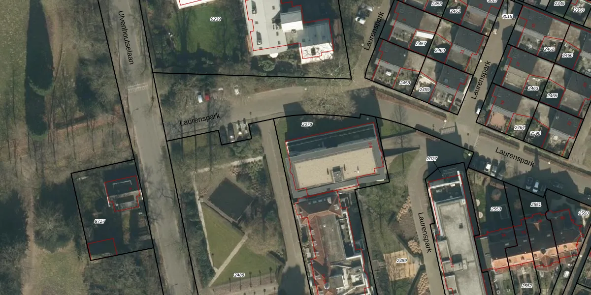 Het perceel waarop Laurenspark 2 staat heeft een oppervlakte van 2896 m². Dit is een zeer groot perceel. De perceeloppervlakte wordt geregistreerd door het Kadaster. Gedetailleerde informatie over de maten van dit perceel kunt u vinden in het rapport Kadastrale kaart met maatvoering van Laurenspark 2.