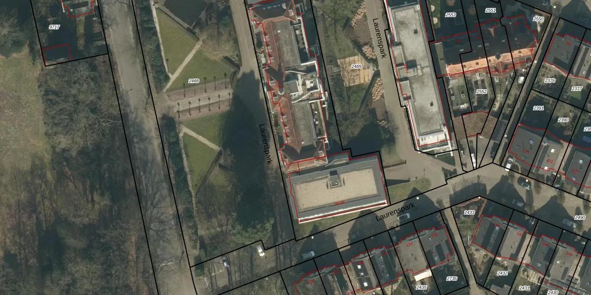 Het perceel waarop Laurenspark 32 staat heeft een oppervlakte van 2896 m². Dit is een zeer groot perceel. De perceeloppervlakte wordt geregistreerd door het Kadaster. Gedetailleerde informatie over de maten van dit perceel kunt u vinden in het rapport Kadastrale kaart met maatvoering van Laurenspark 32.